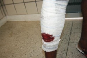 Foi vítima de arma branca (faca), na manhã desta segunda-feira, (29/04), no bairro Tancredo Neves, em Teixeira de Freitas, o senhor Jurandir Rodrigues Lima, 42 anos, apontador, morador da Floriano Peixoto, bairro Redenção. Segundo relatos da vítima, o mesmo se dirigia ao trabalho no ônibus da empresa,quando foi surpreendido pelo um ex.funcionário da empresa com três investidas de golpes de faca, gritando perdeu malandro.Em defesa, a vítima se defendeu com pontapés sendo atingido com uma facada na perna com corte que pegou 14 (quatorze) pontos.