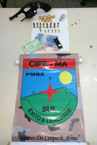 Realizando buscas nas proximidades, os policiais militares encontraram escondido no banheiro de uma casa um adolescente, estando em sua posse um revólver calibre .38, com a numeração suprimida, 08 cartuchos do mesmo calibre, 07 cartuchos calibre .22 e uma porção de maconha. Na casa do adolescente foram encontradas ainda 74 pedras de crack. O adolescente infrator e todo o material foram apresentados à delegacia da área.