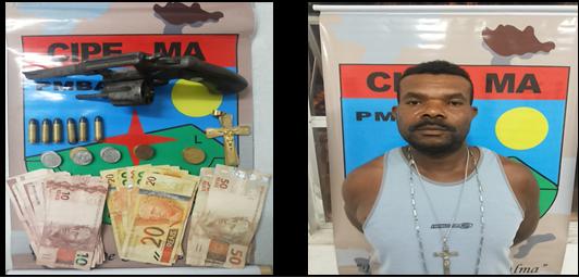 No dia 08 de fevereiro do presente ano, às 00h30min, policiais militares da CAEMA, realizavam rondas à Rua da Bandeira, Centro de Juerana, o condutor do veículo VW/Gol, cor cinza, placa JQS-8063/BA, avistou a presença da viatura, tentou evadir –se do local, mas não logrou êxito, com a realização da abordagem no interior do veículo foi localizado dentro de uma bolsa, um revólver calibre .38 marca Taurus, nº 167189, municiado com 06 (seis) cartuchos intactos e a importância de R$ 464,40 (quatrocentos e sessenta e quatro reais e quarenta centavos).