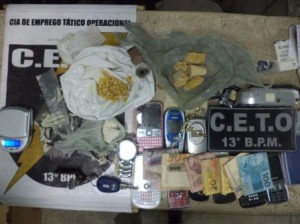 Foram encontrados no citado endereço um adolescente de 16 anos e CLEUNICE SILVA CARAÍBA, 44 anos, que foram abordados, sendo encontrada pequena porção de crack. Ao adentrar ao imóvel, foram encontrados no telhado 07 pedras brutas de crack, pesando 70g, 160 pedras de crack prontas para o consumo, 16g de cocaína, 02 balanças de precisão, 01 câmera filmadora, R$ 647,25 em espécie, 01 cordão de material semelhante a ouro e 12 aparelhos de telefone celular. A suspeita, o adolescente e todo material ora descrito foram apresentados à Delegacia de Tóxicos e Entorpecentes.