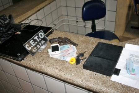 Ambos foram ouvidos, para oitivas pelo Delegado plantonista, Dr Manoel Andretta. Com os menores foram encontrados, 01 (um) revolver cal.32, 01 (um) notebook, 01 (um) Playstation, 01 (um) celular branco, 01 (um) relógio, R$ 182,00 (Cento e oitenta e dois) reais em espécie, fruto de uma ação praticada pelos dois menores, em uma residência no Bairro, Ouro Verde, em Teixeira de Freitas, na tarde deste domingo(28/07) em Teixeira de Freitas.As vítimas reconheceram os matérias e receberam de volta.