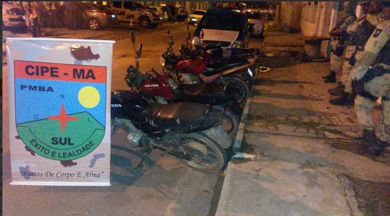 No dia 16 de março de 2014 a CIPE-MA desencadeou uma ação para combater a circulação de motos irregulares no Distrito de Itaitinga, Município de Alcobaça. Na ação foram apreendidas 07 motocicletas sendo elas 01 Dafra,cor vermelha, placa MSI 7425 São Mateus-ES; 01 Biz de cor preta; 01 Suzuki de cor preta, ambas sem placa e uma Titan de cor amarela, placa JQJ 1855 que após consulta no Infoseg apresentaram apenas restrições de ordem administrativa, sendo conduzidos para o pelotão da Companhia Independente de Policiamento Rodoviário em Teixeira de Freitas e em seguida seriam apresentados na CIRETRAN. Também foram apreendidas 03 Titan sendo uma na cor vermelha e duas na cor preta todas sem placa e apresentando sinais de adulteração no chassis, levando a crer que poderiam ser fruto de uma ilicitude penal, furto ou roubo. De posse das motos que apresentavam suspeita de serem fruto de ilícito estavam Agnaldo Romão Filho e Jose Bernardo de Jesus Portela e um outro suspeito que ao avistar as guarnições abandonou o veiculo e empreendeu fuga por entre as propriedades rurais. Jose Bernardo alegou ter comprado a motocicleta de Jose Elder Gaspari que estava no local e por sua vez afirmou que também afirmou ter comprado a moto de um terceiro, João Sergio Casagrande sendo este localizado em sua residencia. Diante da situação todos foram conduzidos e apresentados juntamente com os veiculos apreendido na Delegacia de Policia Civil de Alcobaça sendo lavrada a ocorrência de nº 494/2014.