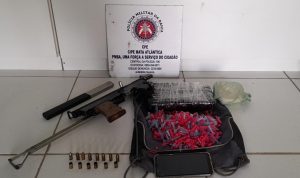 Policiais da Companhia Independente de Policiamento Especializado (Cipe) Mata Atlântica localizaram um suspeito com uma submetralhadora de fabricação caseira, um quilo de pasta base e 300g de cocaína durante o cumprimento a mandado de busca e apreensão, no bairro de Bom Jesus, na manhã desta sexta-feira (13), em Teixeira de Freitas.