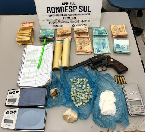 Durante buscas na casa foram encontrados 150 gramas de drogas – entre maconha, crack, cocaína e êxtase-, um revólver calibre 38, três balanças de precisão, embalagens para acondicionar os entorpecentes e a quantia de R$ 9.097.