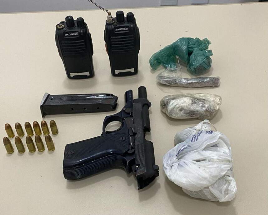 Além da arma, os policiais encontraram com o suspeito uma mochila contendo dois rádios comunicadores da marca Baofeng, 126 gramas de maconha embaladas em sacos plásticos, cinco cartuchos intactos de munição calibre 9mm e roupas diversas.