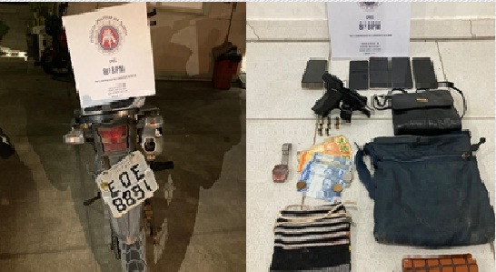 Nesse momento, os policiais militares se depararam com 06 indivíduos distribuídos em 03 motocicletas, onde os garupeiros começaram a efetuar disparos contra a guarnição, que revidou a agressão. Os criminosos se espalharam para facilitar a fuga, mas um deles foi encontrado ferido em uma rua próxima portando uma pistola Calibre .380 com 08 munições intactas e quatro bolsas femininas penduradas no pescoço.