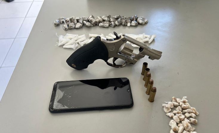 Durante a ação policial foram apreendidos, um revólver calibre 38 com 5 munições, sendo 3 picotadas e 2 deflagradas, 33 buchas de maconha, 33 pinos de cocaína e 32 pedras de crack.