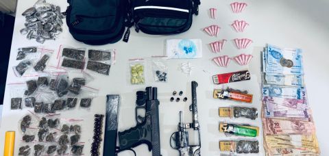 Com o líder de facção e o comparsa foram apreendidos uma pistola, um revólver, carregador, munições e porções de entorpecentes.