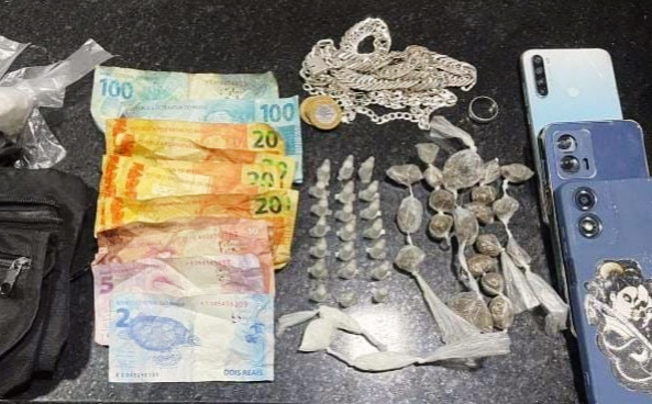 Já na tarde de domingo (05), outra guarnição do 28º BPM, durante rondas pela Rua Liberalino, no bairro Juca Rosa, avistou uma mulher em atitude suspeita. Ao perceber a presença dos policiais, ela tentou se desfazer de um saco, que foi recolhido e continha 4 pedras de crack, 23 pinos de cocaínae 1 grama de maconha. A mulher foi detida e apresentada na Delegacia de Eunápolis, junto com o material apreendido.