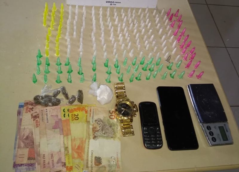 Os policiais realizaram ainda uma busca no local onde os sujeitos se encontravam e em um canteiro próximo encontraram uma sacola plástica com 206 pinos de cocaína, 9 buchas de maconha, 1 balança de precisão e mais R$ 262,00 em espécie.