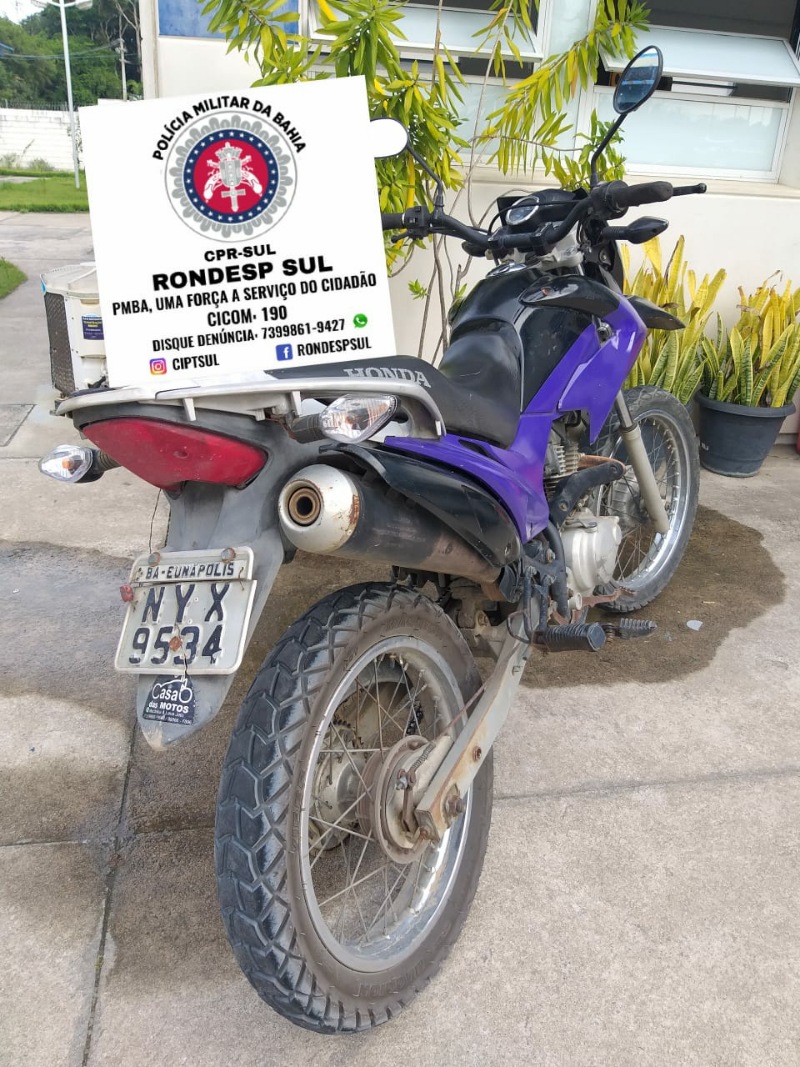 A motocicleta Honda Bros foi roubada na noite da última terça-feira (27/01), em Eunápolis. Também foi apreendido na ação policial, uma espingarda calibre 28, com duas munições sendo uma deflagrada e outra intacta